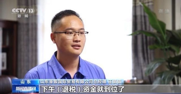 山东重锻国际贸易有限公司总经理 王镇镇:上午递交了资料之后,下午资金(退税)就到位了,速度(之快)我们也没有料想到。我们就抓紧时间运用这笔资金第一时间解决材料、物料等问题。
