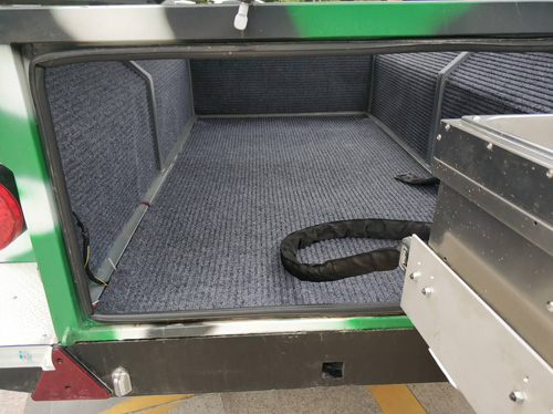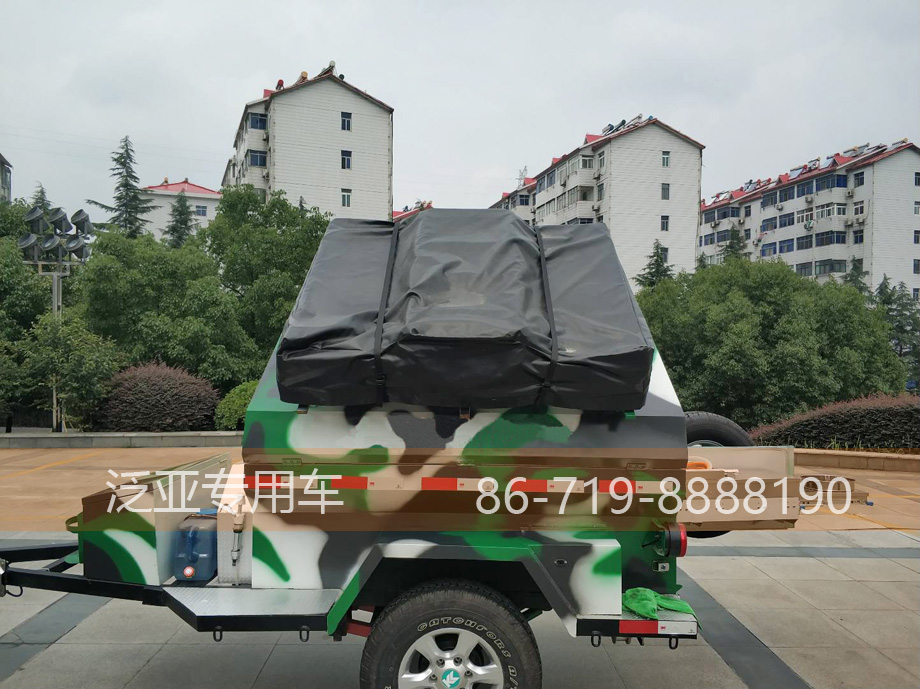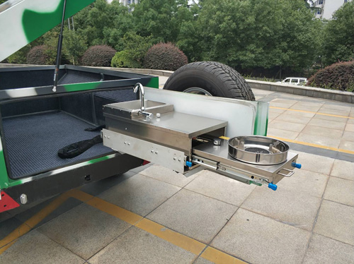 该车采用国产牵引系统(可选装德国AL-KO牵引器),车内大容量储物空间。配有1条备胎固定在后门,后门打开后是一个户外厨房,采用液化气灶台,可进行简单烹饪。
