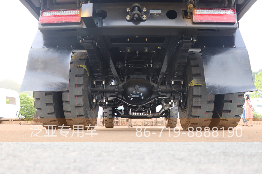 | 后桥 | 东风德纳桥 16T ;轮边减速双联后桥,轴间、轮间差速锁, 速比6.88 |