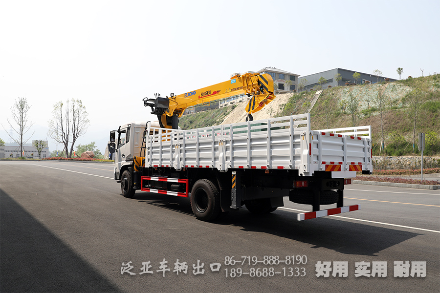 东风10吨4*2随车吊,采用徐工SQ10SK3Q四节臂直臂吊机,最大可起吊10吨,吊臂最大可延伸至12米,升高至14米,完全伸展后吊机可承重1.5吨货物。